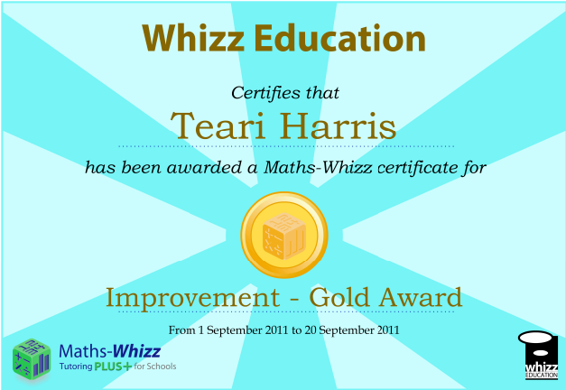 In my class out of the year 7 students I received the Gold Award certificate for the most improvement in my Maths Whizz. The one that I have really improved in is my Pencil and Paper Division. I have also improved in my Addition and Subtraction Rapid Recall, I have improved in my Percentages, Ratios and in my Pencil and Paper Adittion and Multiplication.